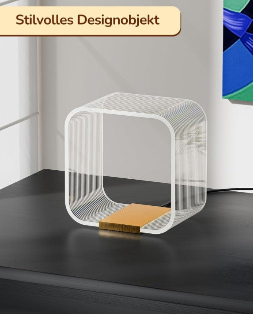 Kompakt und vielseitig einsetzbar: Mit ihrem quadratischen Format (16,2 × 15,5 × 11,0 cm) benötigt die Tischlampe wenig Platz. Dank 165 cm Kabel und praktischem Ein-/Ausschalter eignet sie sich perfekt für Nachttisch, Schreibtisch oder Bücherregal.