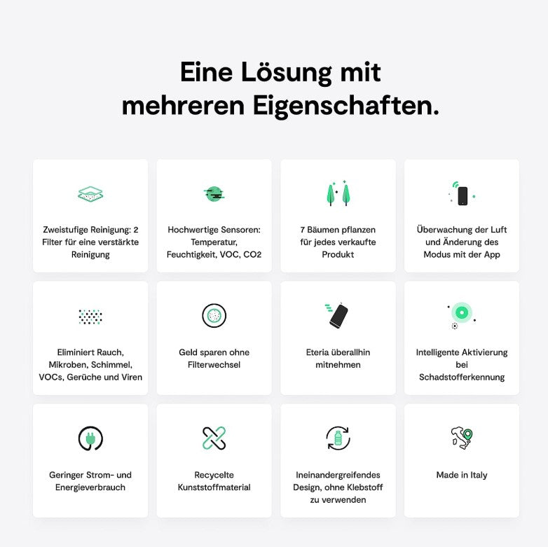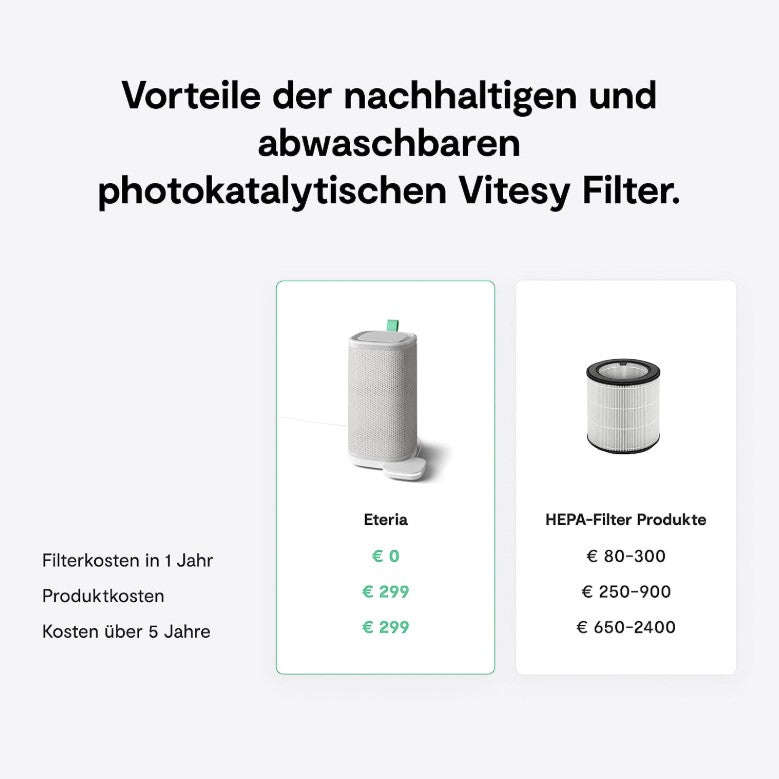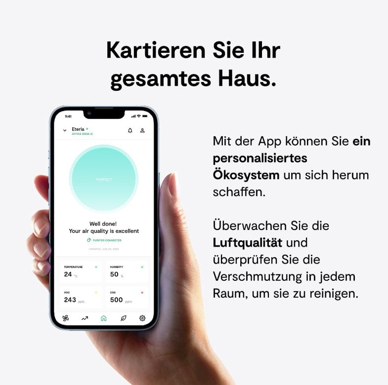 Der Eteria Luftreiniger mit intelligentem Luftüberwachungssystem ist ein innovatives Gerät zur Überwachung und Reinigung der Raumluft. Mit seinem abwaschbaren photokatalytischen Filter, den Sensoren für Temperatur, Feuchtigkeit, VOCs und CO₂-Äquivalente sowie der App-Anbindung sorgt Eteria für dauerhaft saubere Luft – ohne Filterwechsel und ohne Folgekosten.